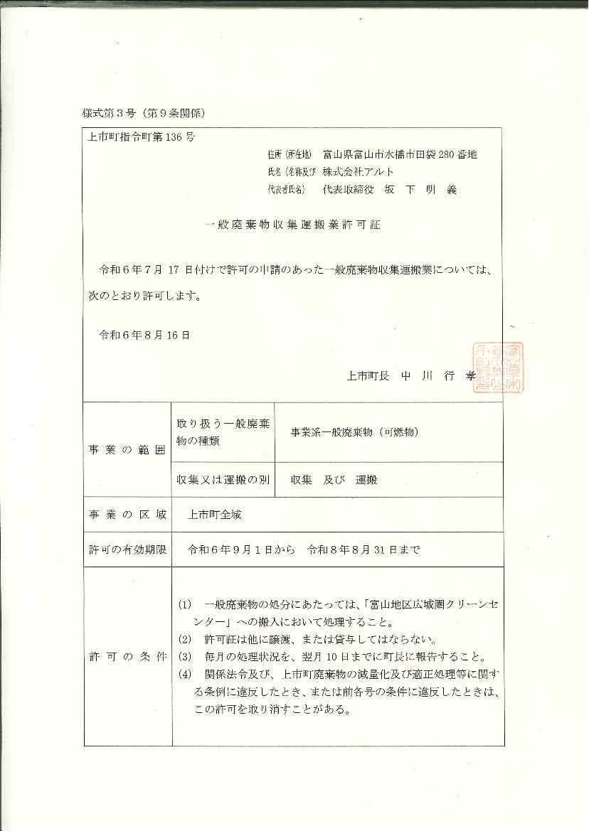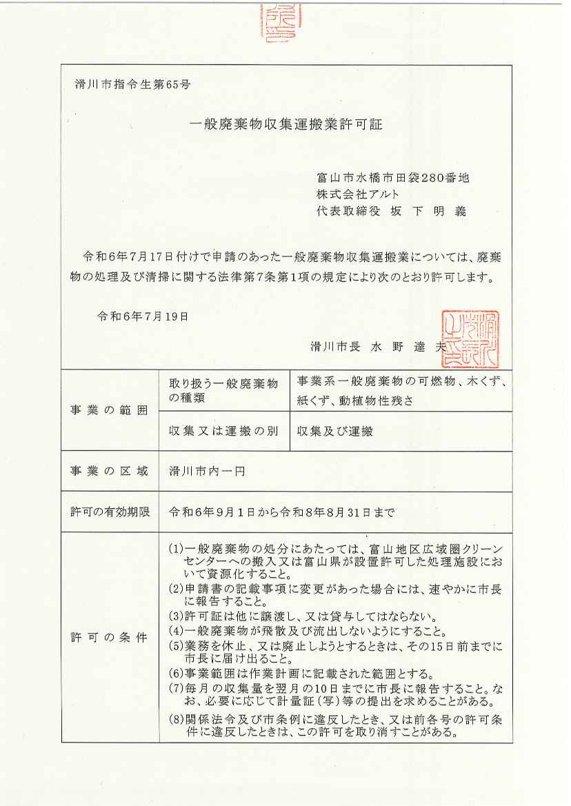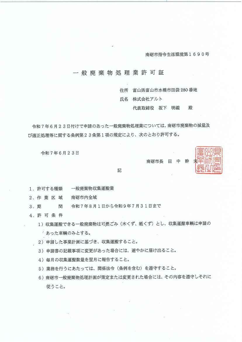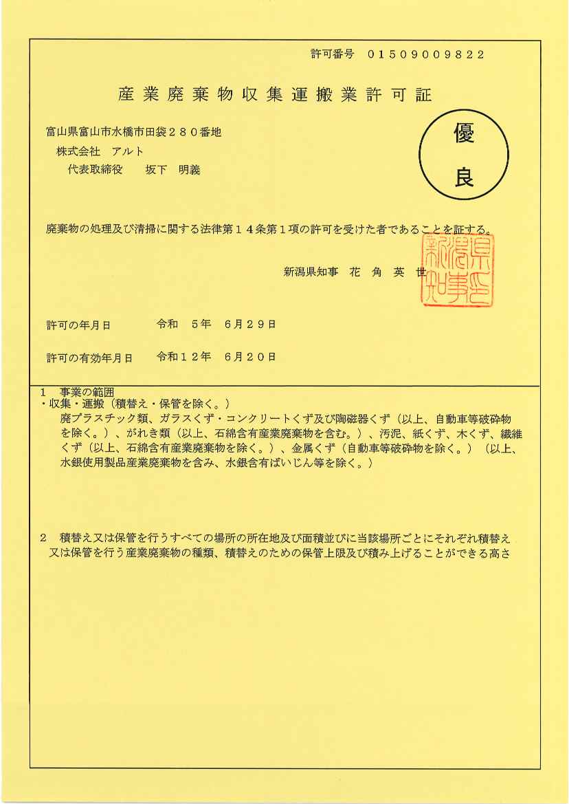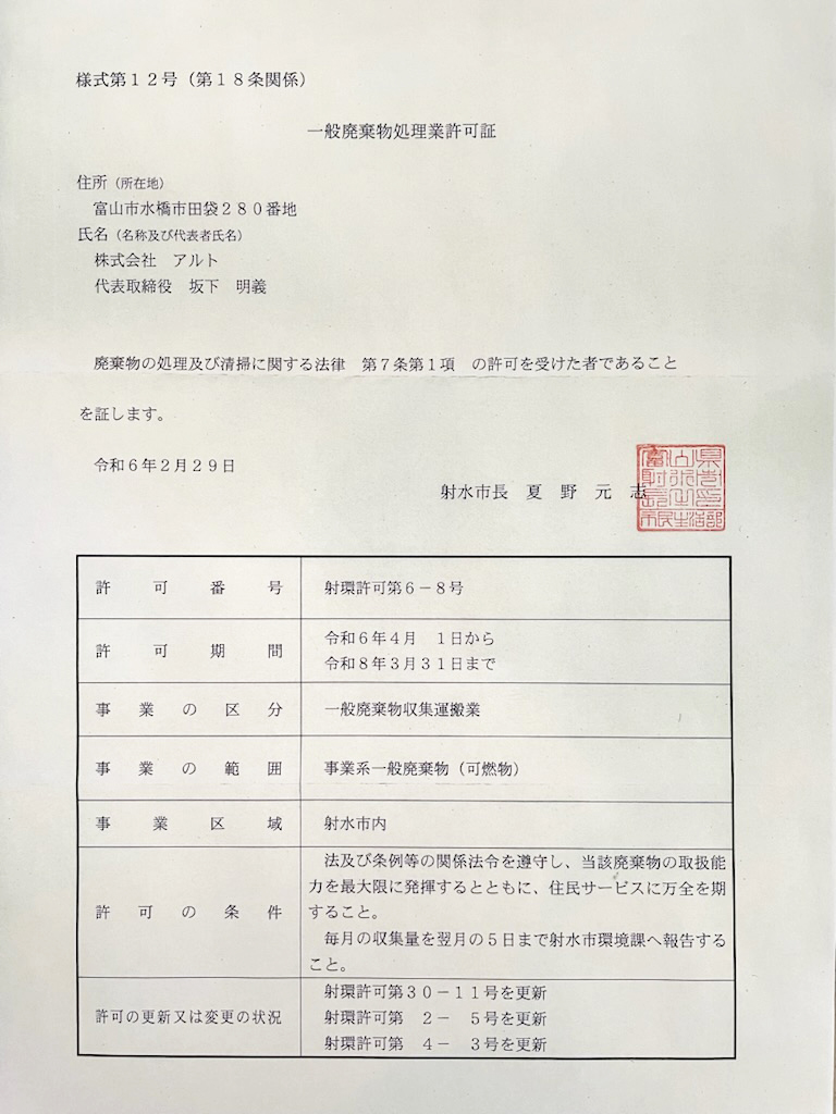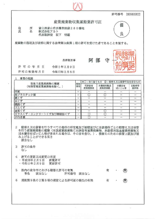- 長野県産業廃棄物収集運搬業 許可取得