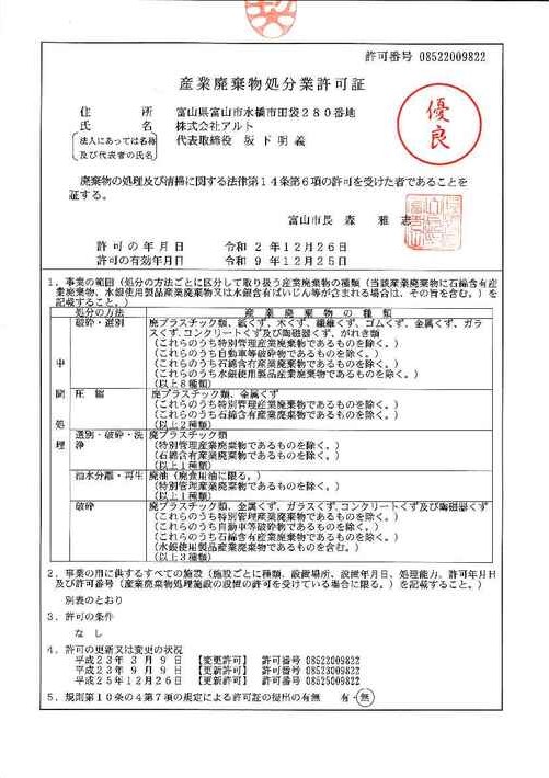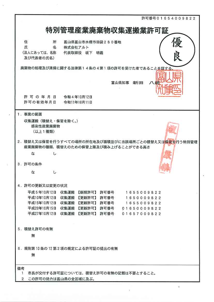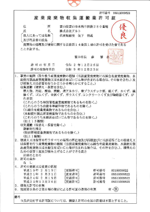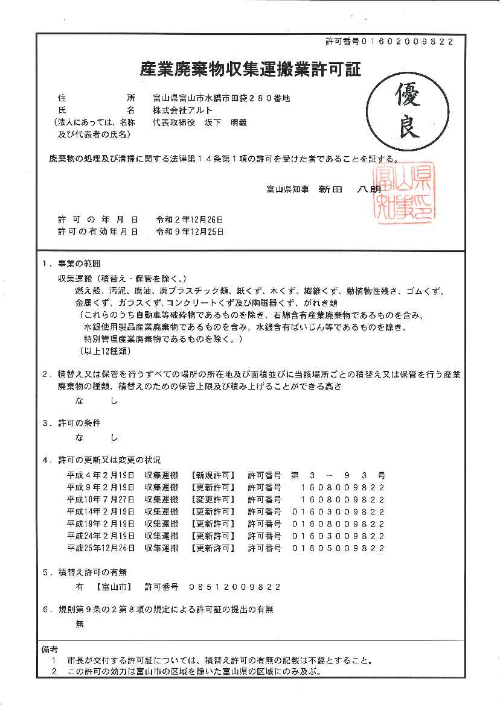 - 富山県特別管理産業廃棄物収集運搬業の優良認定を取得