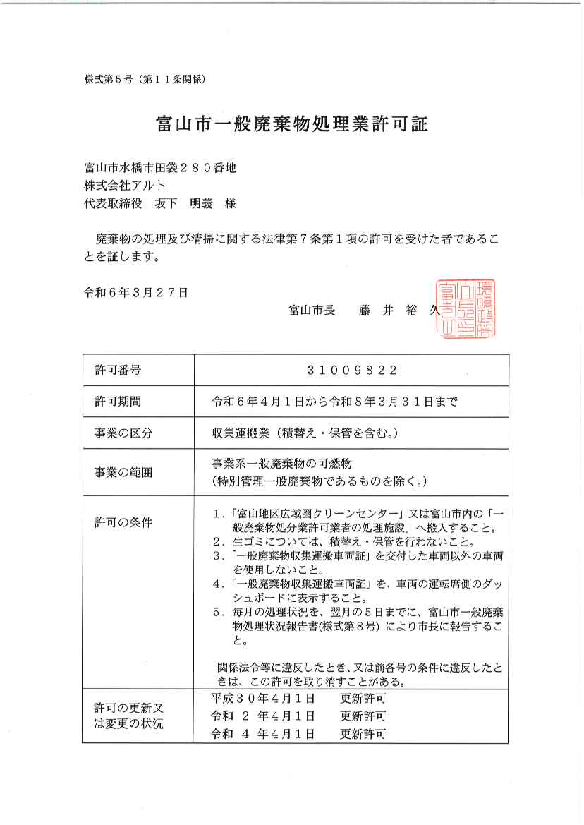 - 富山県産業廃棄物収集運搬業の優良認定を取得