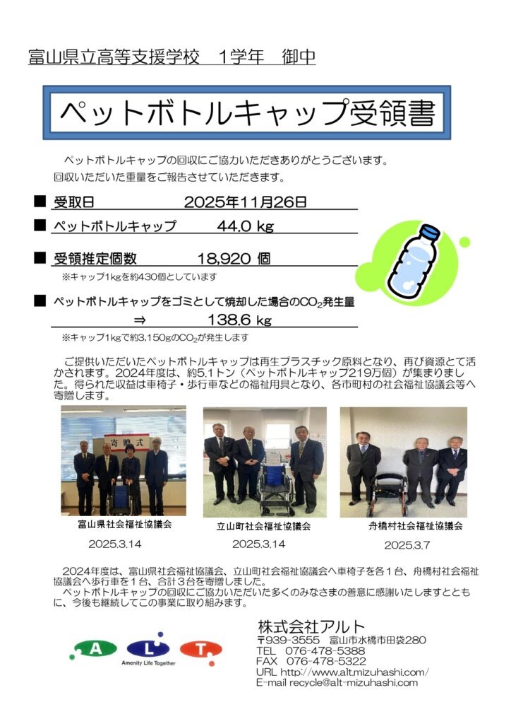 見学に際し、ペットボトルキャップ44㎏(受領推定個数18,920個)をご提供頂きました。得られた収益は車椅子・歩行車などの福祉用具として、各市町村の社会福祉協議会等へ寄贈させて頂きます。